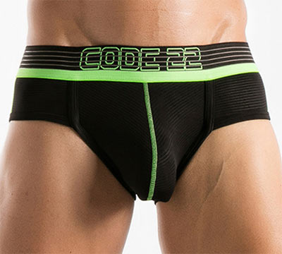 Description : Slip coupe taille basse avec ceinture élastique super douce, rayures rehaussée vert fluo. Logo Code 22.